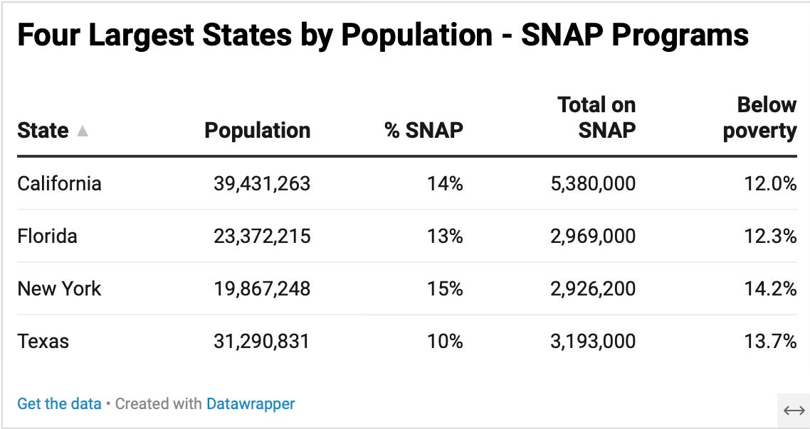 When New York is compared to other large states it has a highest poverty rate but only a slightly higher rate for SNAP. Each state has its own rules for SNAP eligibility. Some states make it more difficult for residents to qualify for the program.