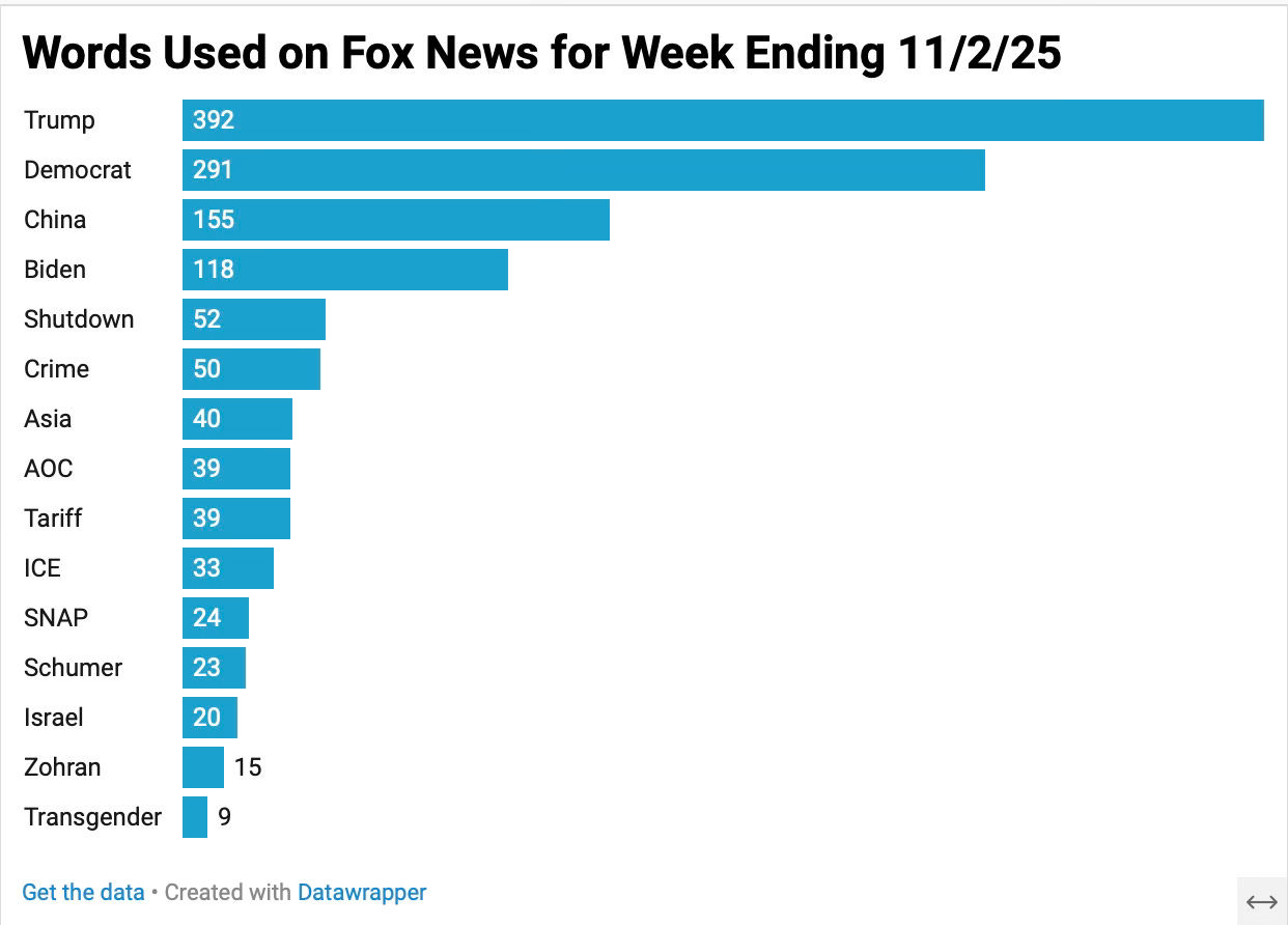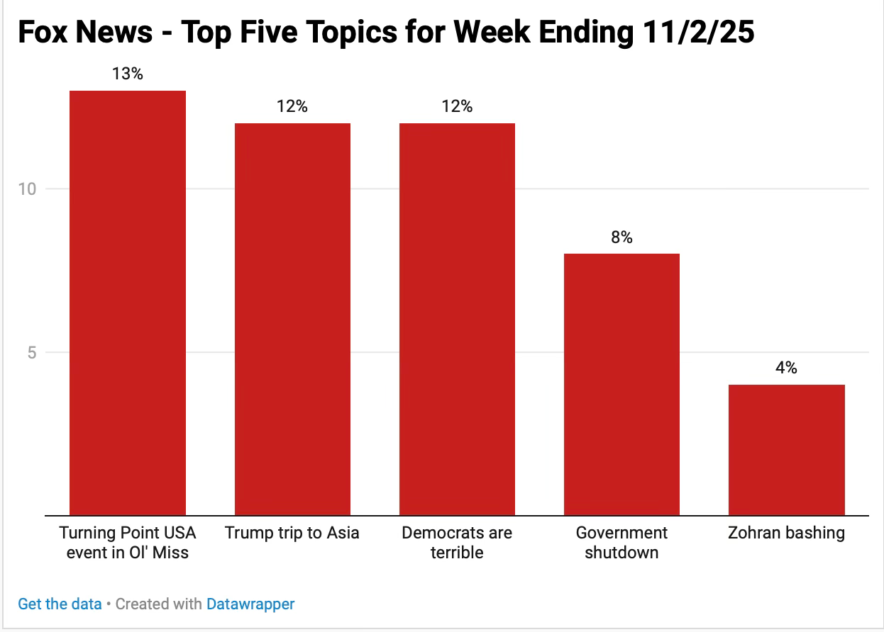 The past week on Fox was wonky - the network spent most of its focus praising Trump during his visit to Asia and promoting Turning Point USA, the nonprofit co-created by the late Charlie Kirk. The network also trashed the Democratic Party while it aggressively promoted Republican gubernatorial candidates in Virginia and New Jersey.