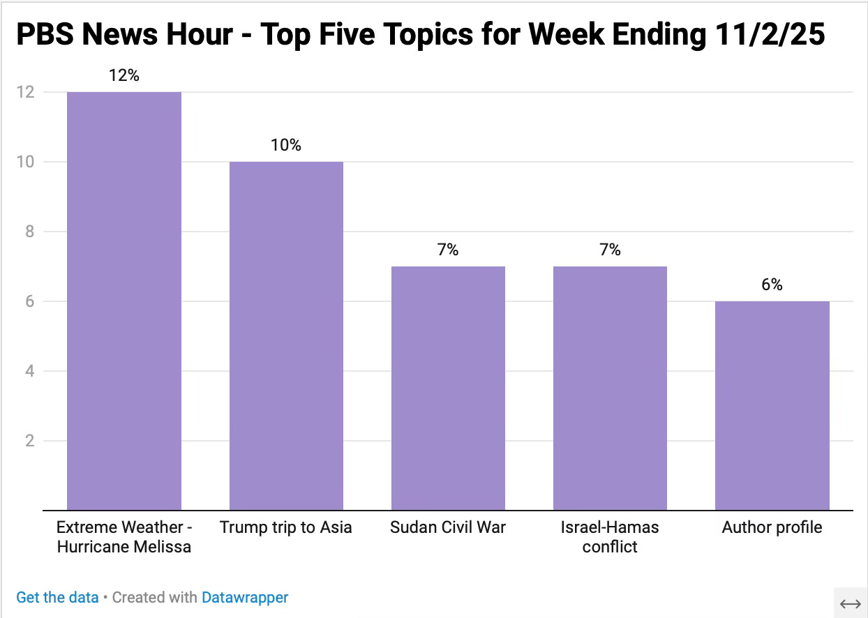 Every week I compare the hours I’ve watched on Fox News to five hours of the PBS News Hour. The following list are stories that PBS covered that Fox News did not. This list has been slightly truncated due to space. Source - PBS News Hour transcripts.