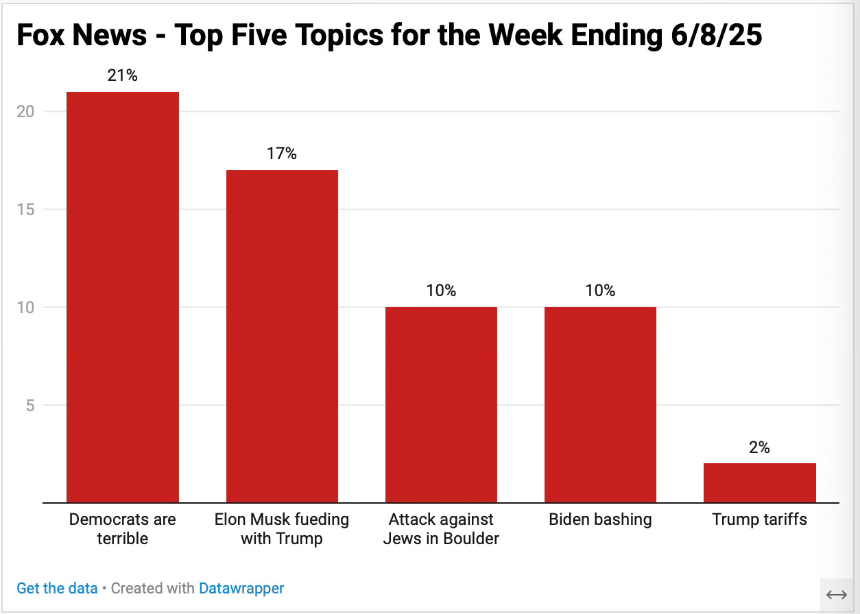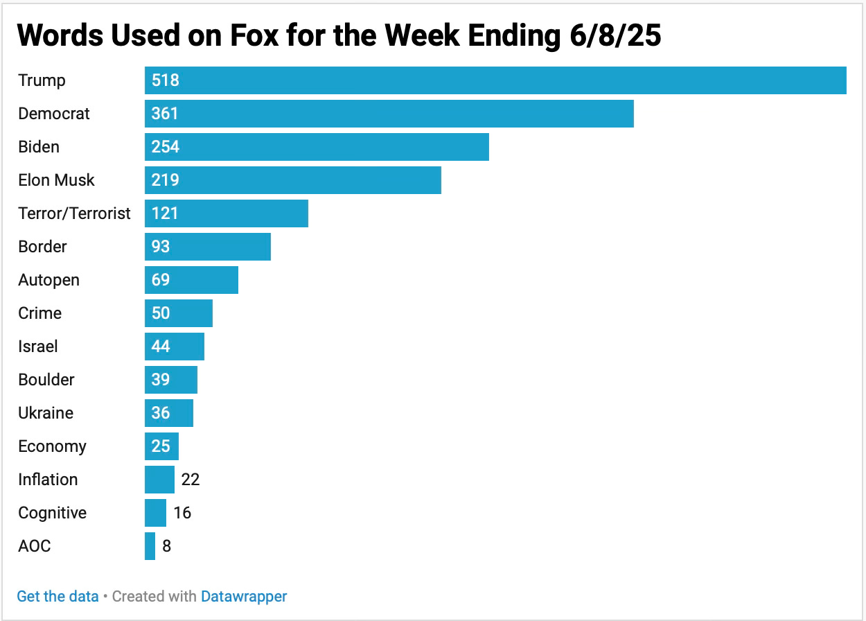 A condensed overview of 18 hours of Fox News for the week ending 6/8/25