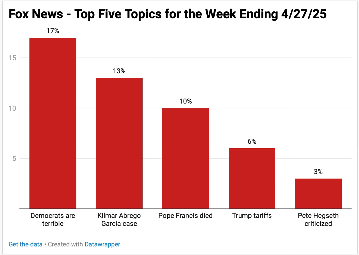 Last week as Americans grew increasingly worried about Trump’s chaotic trade deals Fox News distracted its audience with stories about dark woke Democrats, a renegade dog-walking Tesla vandal, the negative qualities of Pope Francis, the short-comings of due process and the never-ending deep state persecution of Pete Hegseth.