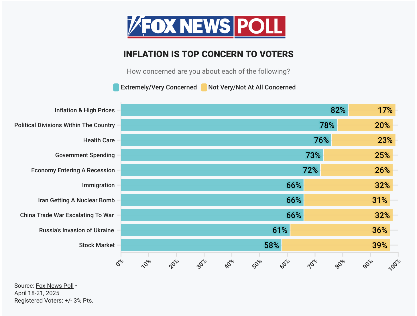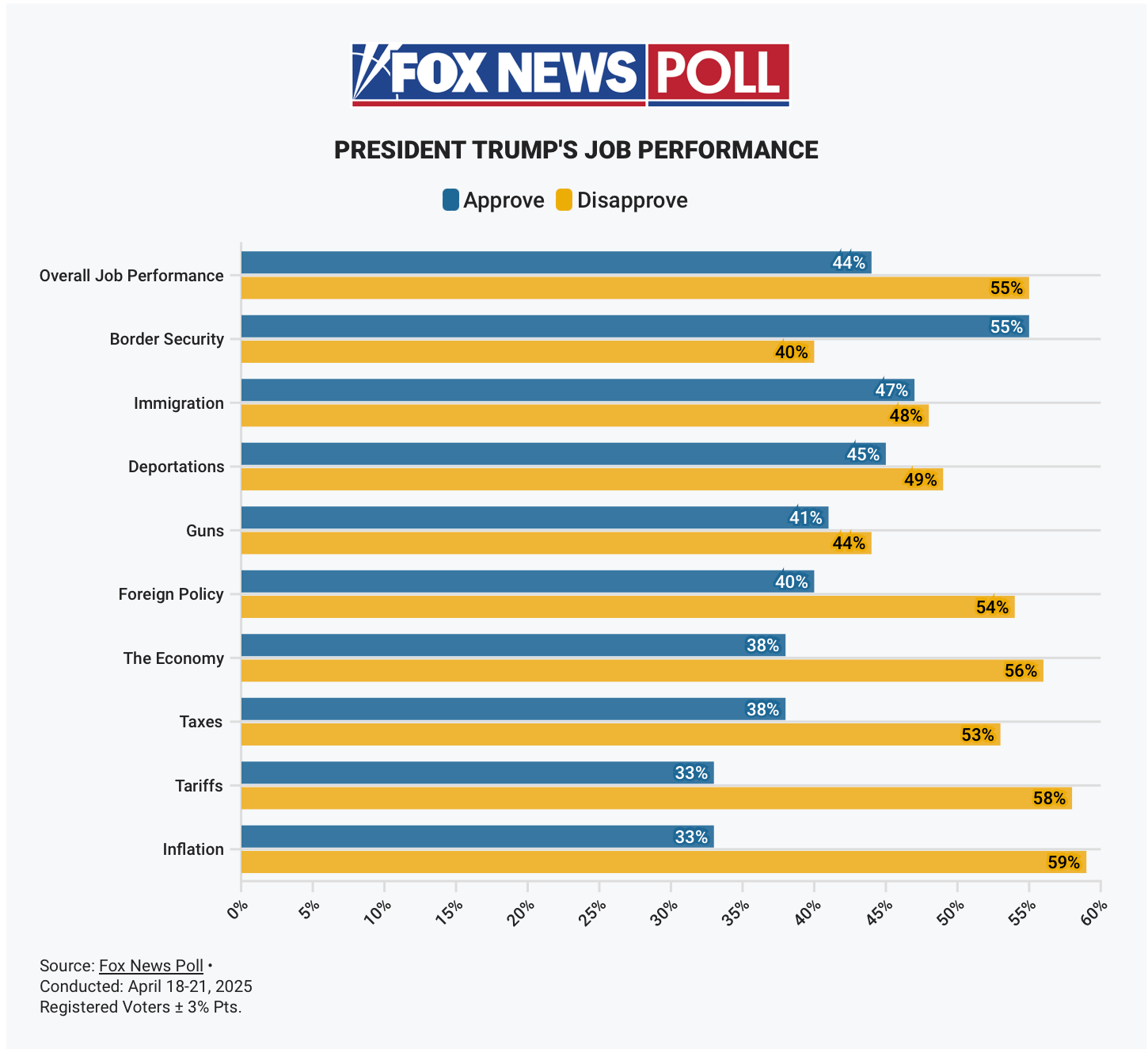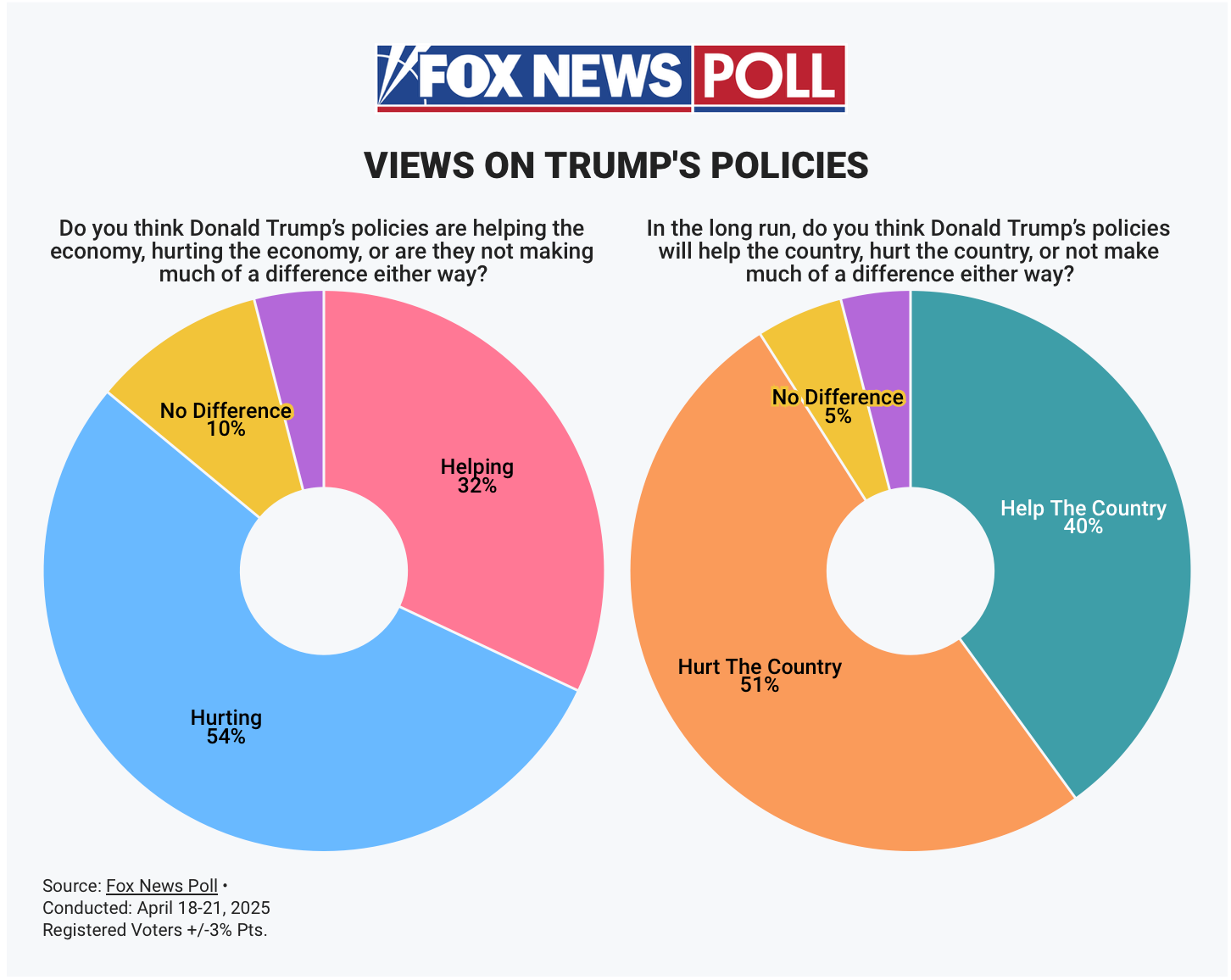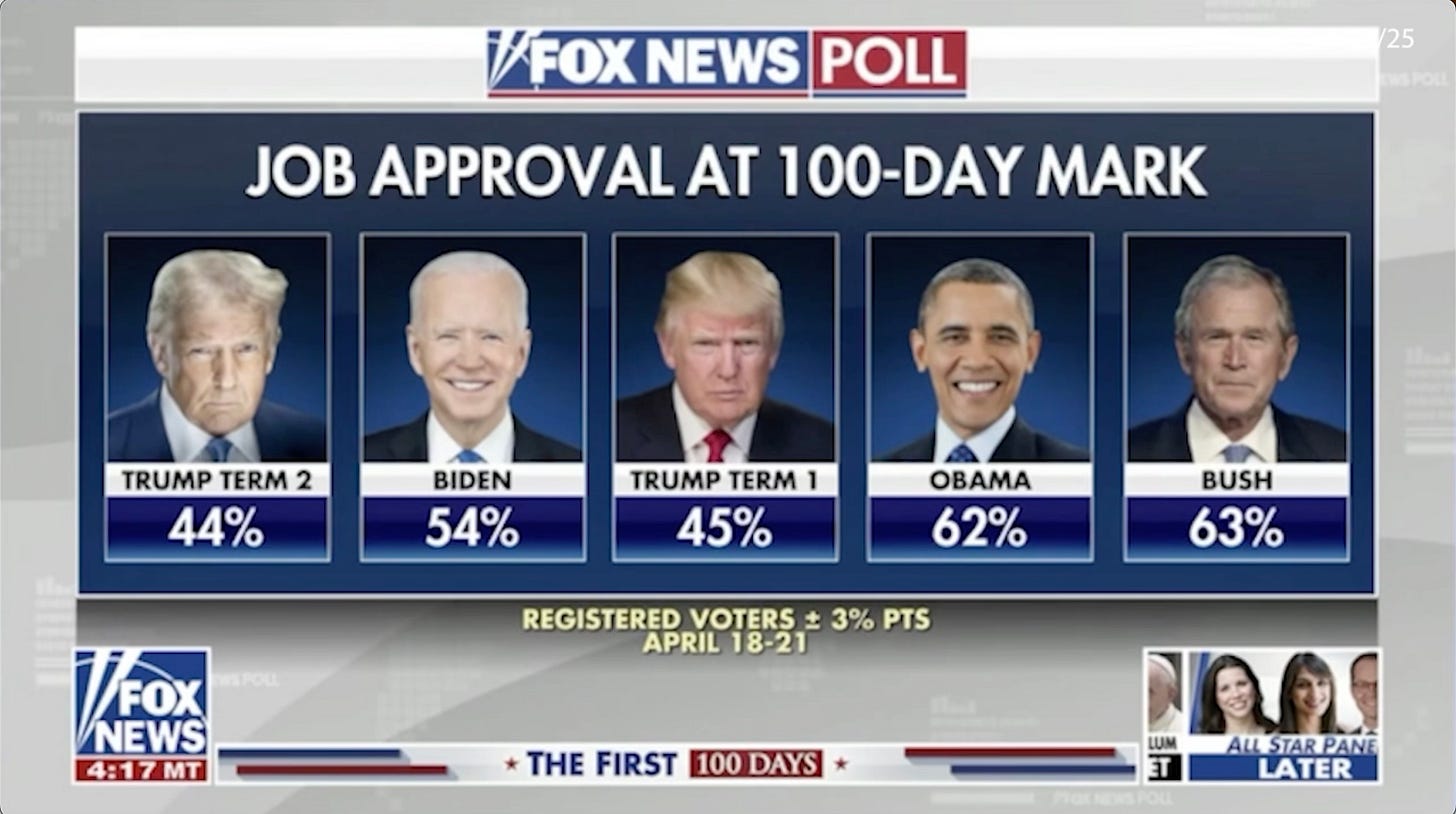 “New Fox polls show nearly three quarters of voters believe tariffs will drive up the cost of products. A record 55% think tariffs hurt the economy and a plurality say they hurt U.S. jobs. 55% say the economy is getting worse for their family, and that Trump's policies are hurting by a 22-point margin.”