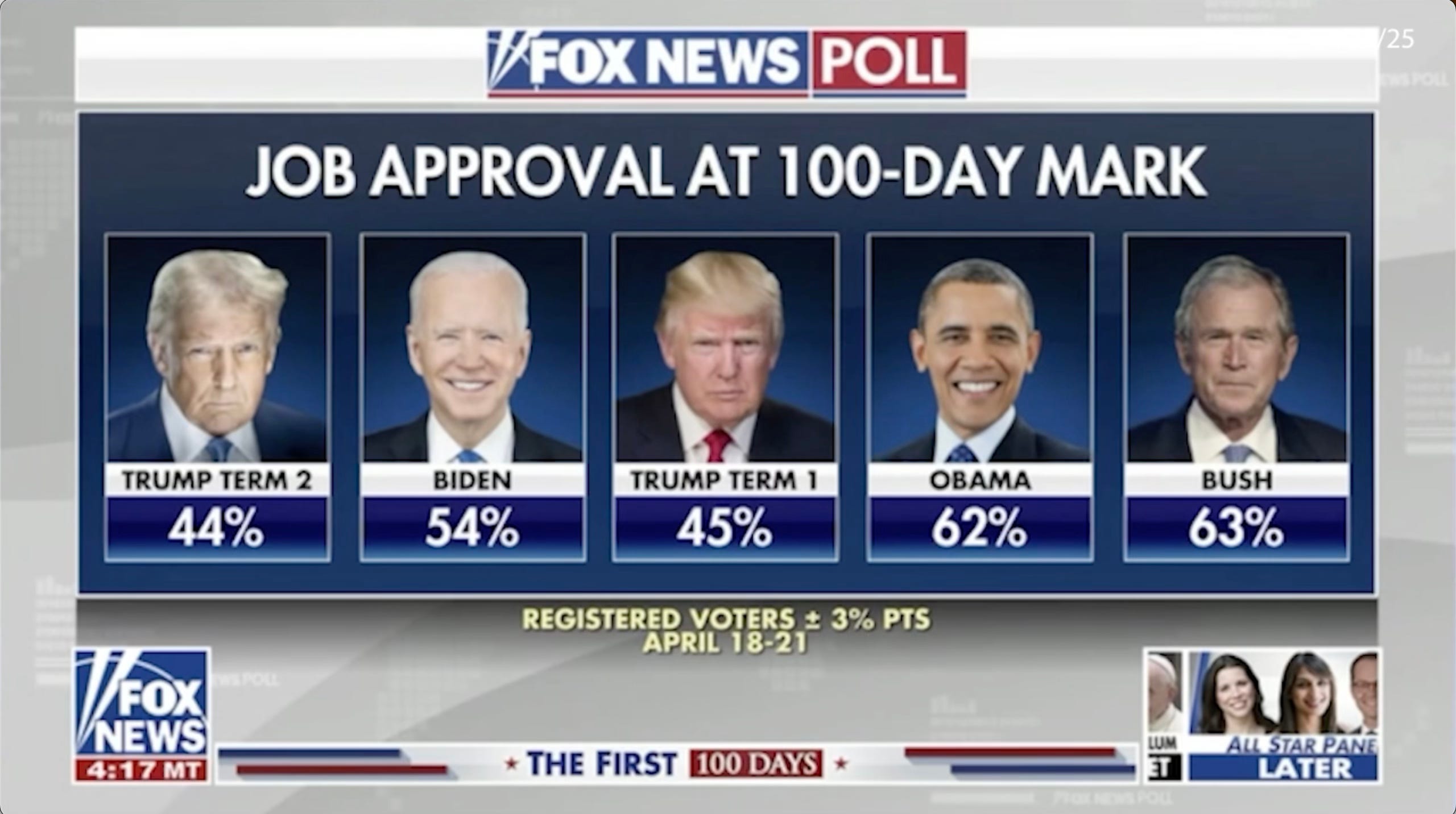 “You look at our new Fox News poll at 100 days job approval compared to other presidents there. You see the president at 44%. And you see his first term at 45% at this mark, the 100-day mark. We have other new polls that are revealing, some concerns about the economy,” said Baier.
