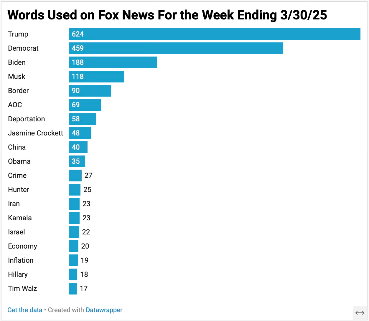 Rep. Alexandria Ocasio-Cortez (D-NY) showed up 69 times in the transcripts. Fox portrayed her as a dangerous radical socialist touring the country with Senator Bernie Sanders (I-VT) as they both plotted the demise of Senator Chuck Schumer (D-NY).