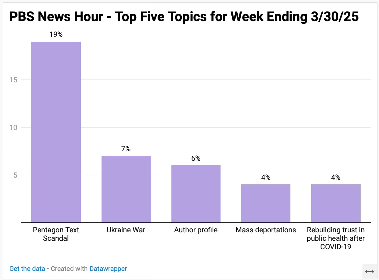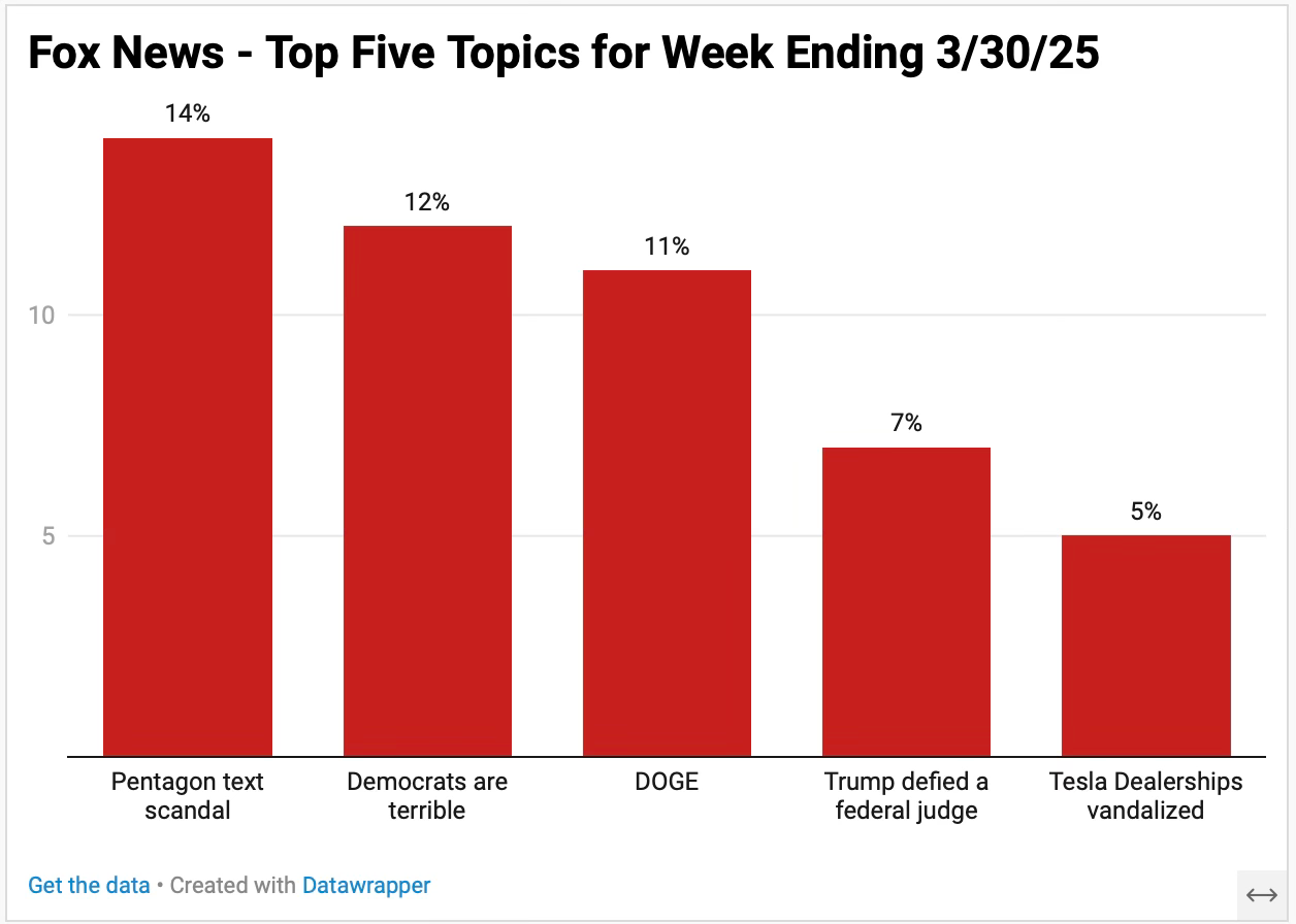 A condensed overview of 23 hours of Fox News for the week ending 3/30/25