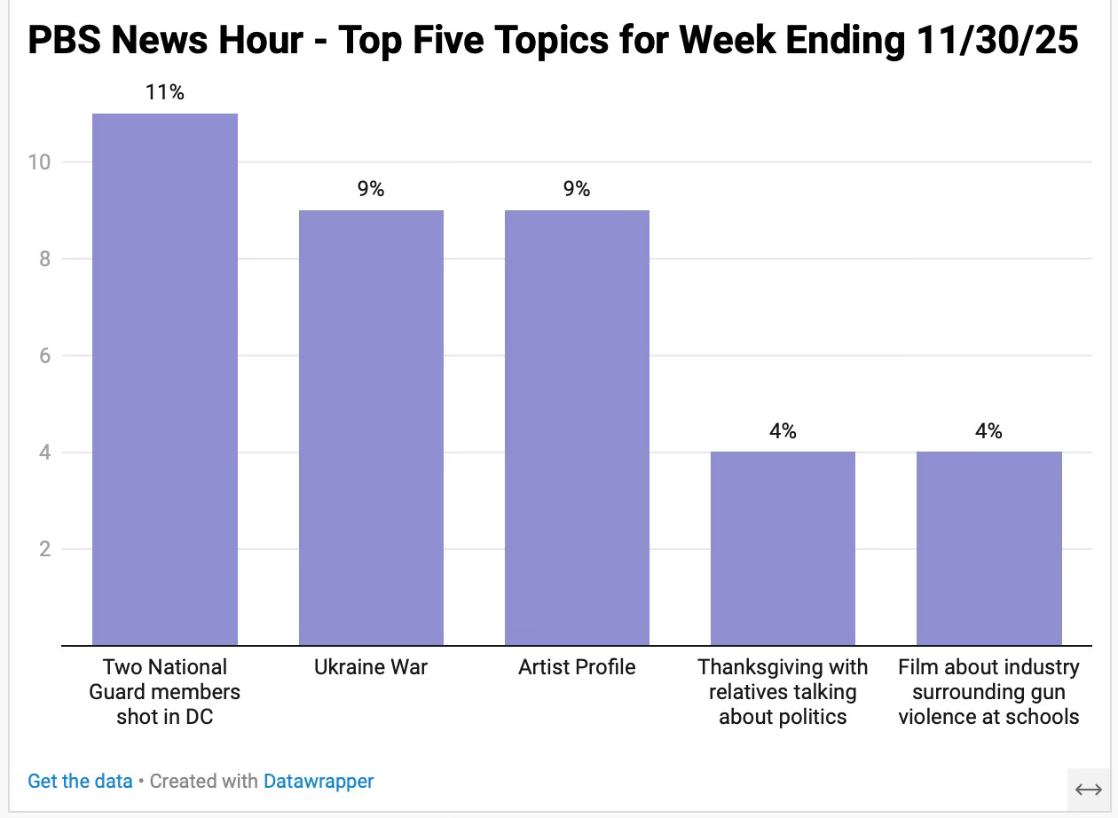Every week I compare the hours I’ve watched on Fox News to five hours of the PBS News Hour. The following list are stories that PBS covered that Fox News did not. This list has been slightly truncated due to space. Source - PBS News Hour transcripts.
