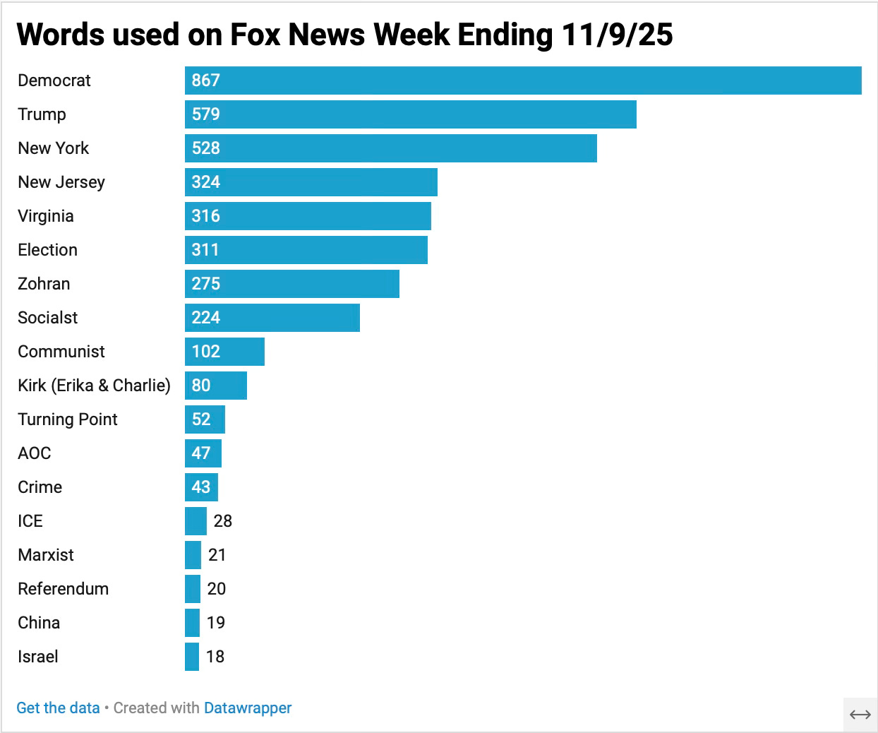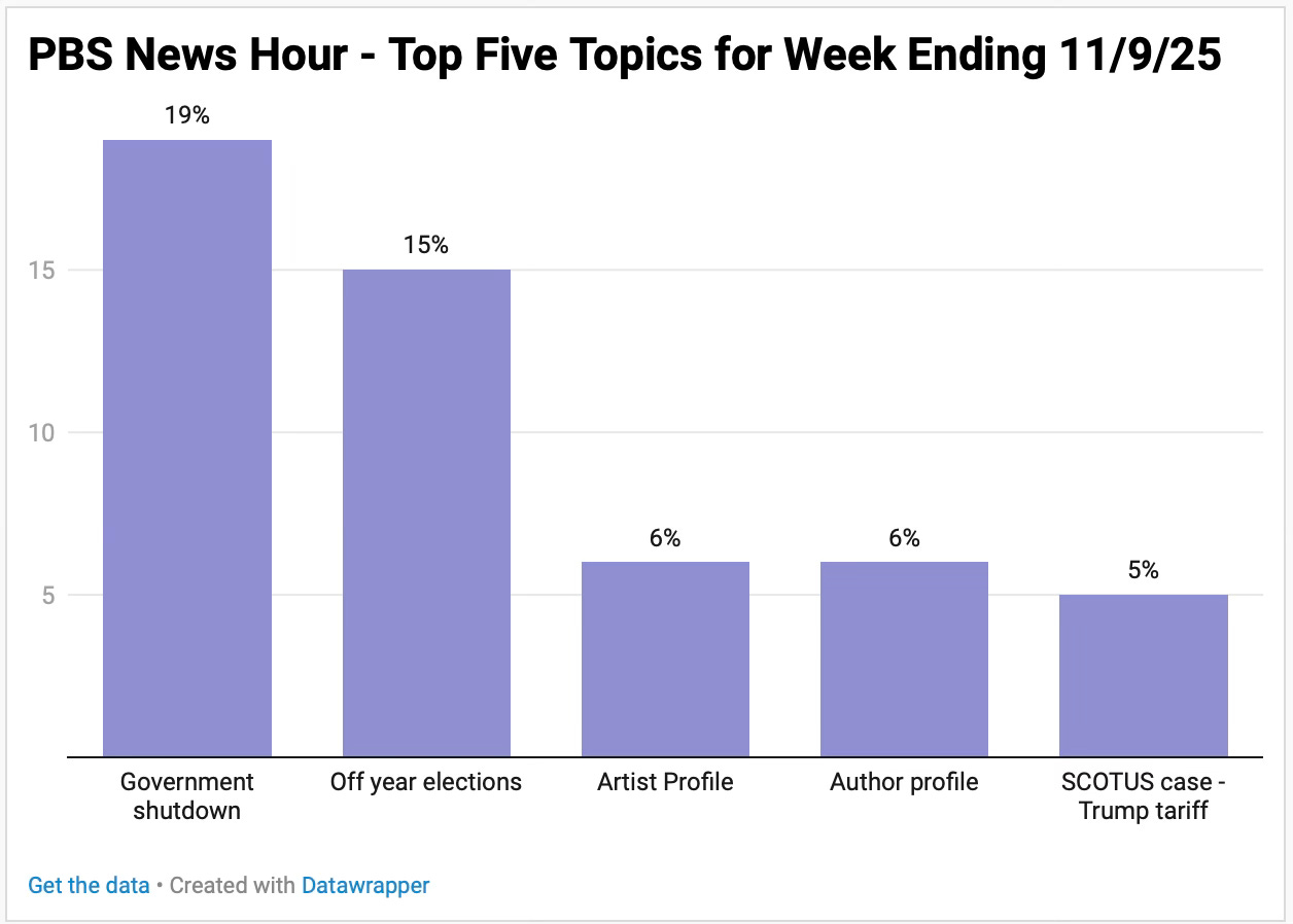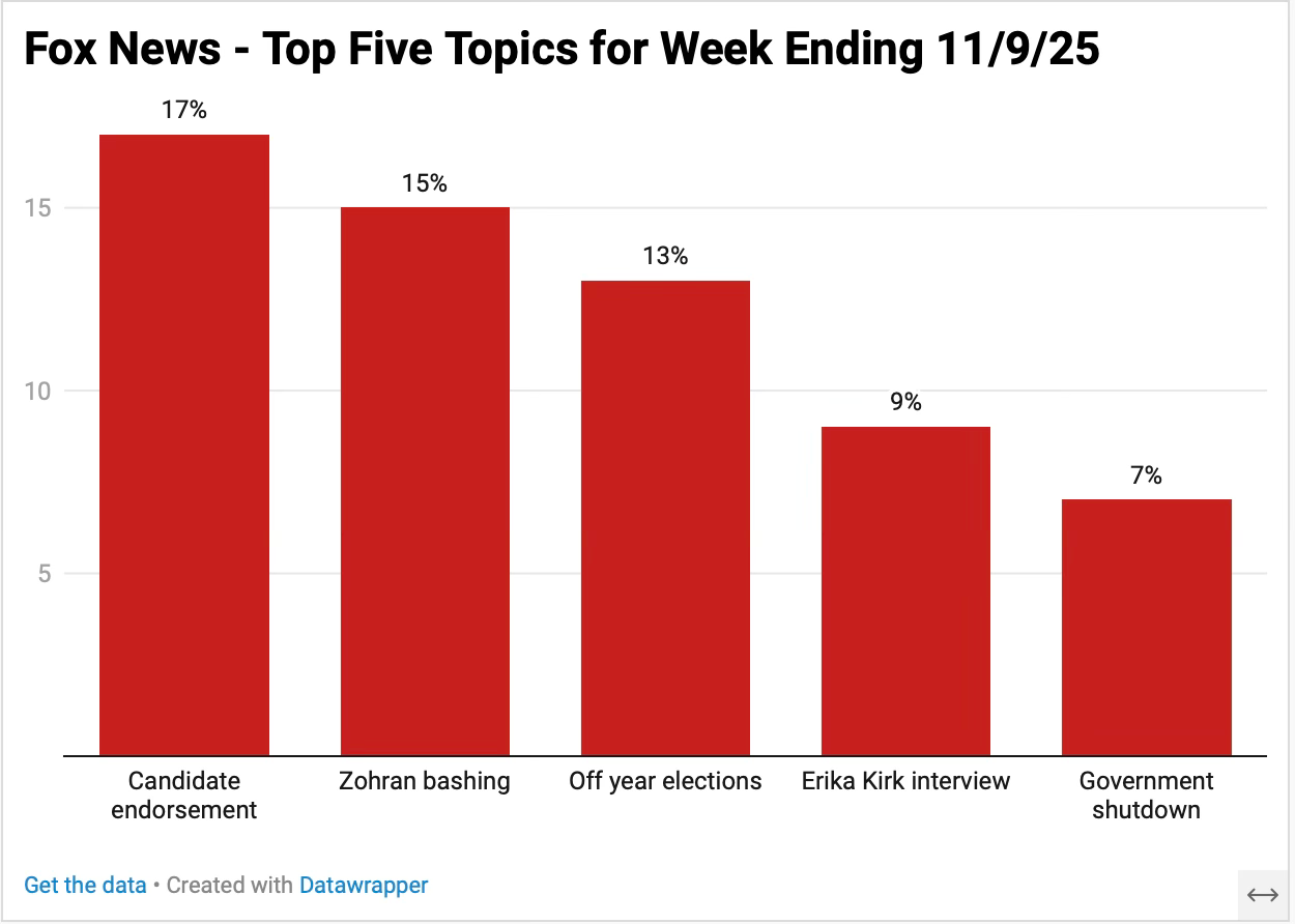 A condensed overview of 25 hours of Fox News for the week ending 11/9/25