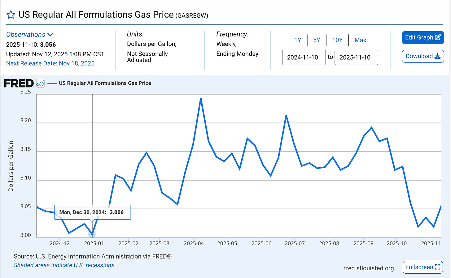 The latest price on this chart $3.019 per gallon is from November 3, 2025. I found similar data for gasoline prices on the U.S. Energy Information Administration (EIA).