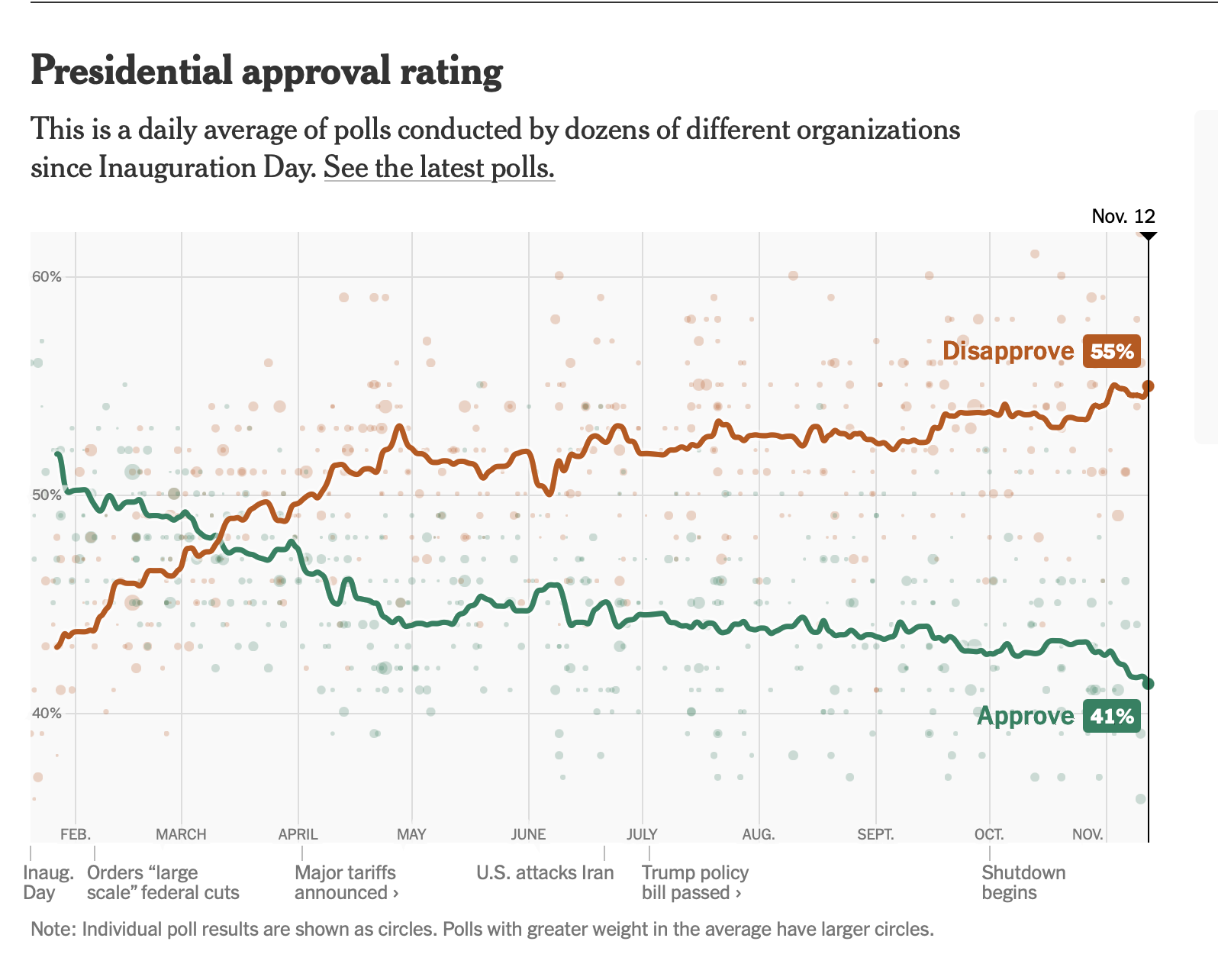 According to an aggregate poll compiled by The New York Times Trump’s approval rating sits at around 41% with 55% of voters disapproving of his job performance.