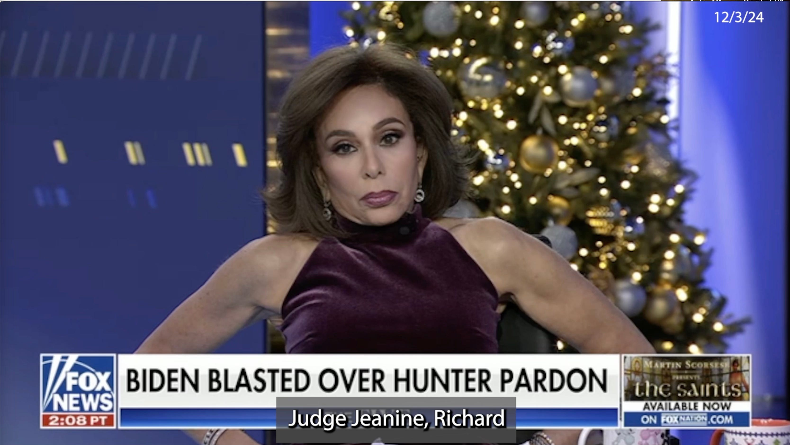 Last week on Fox the outrage machine was on overdrive as the overpaid stuffed shirts expressed their disgust at President Biden’s decision to pardon his son Hunter. Judge Jeanine conveniently forgot to mention that Trump pardoned her ex-husband, Steve Doocy and Emily Compagno both declared that the president-elect was already improving the economy and Jesse Watters joked about annexing Canada and Greenland while promoting conspiracy theories about Iran rigging the 2020 election.